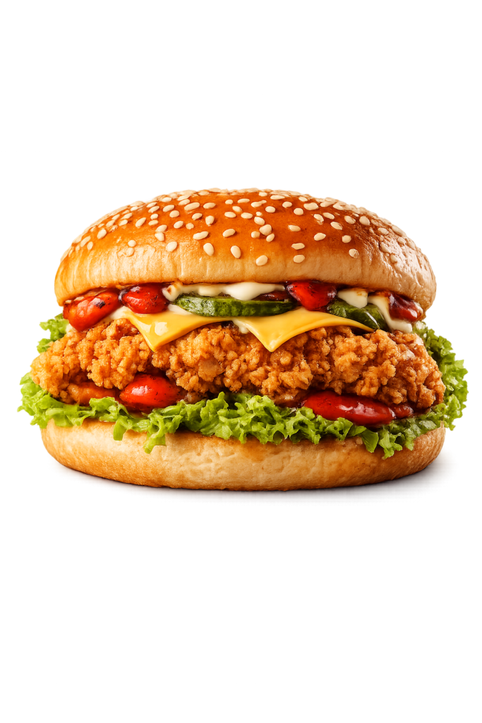 Fillet Burger with Fries β Juicy grilled chicken fillet topped with melty cheese, fresh veggies, creamy sauce, and served with hot golden fries. ππ§π